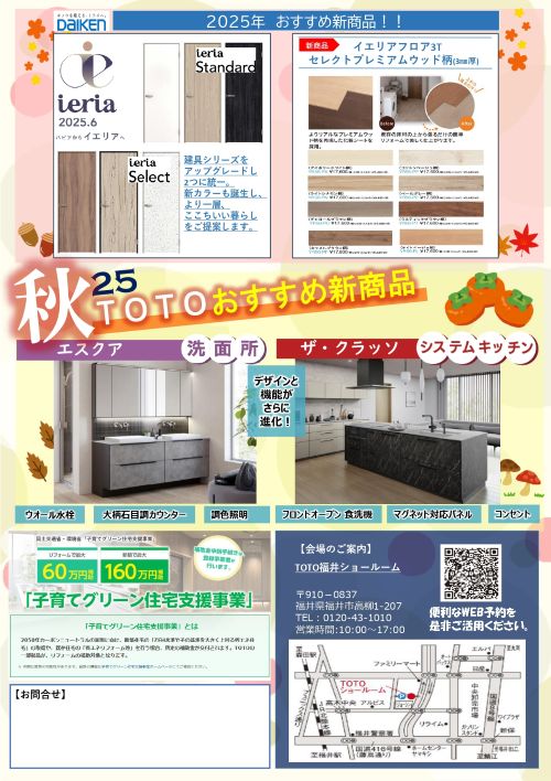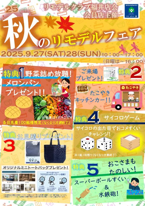 TOTO 福井ショールームでは、福井リモデルクラブ会員店主催の、「秋のリモデルフェア 2025」を開催します。
